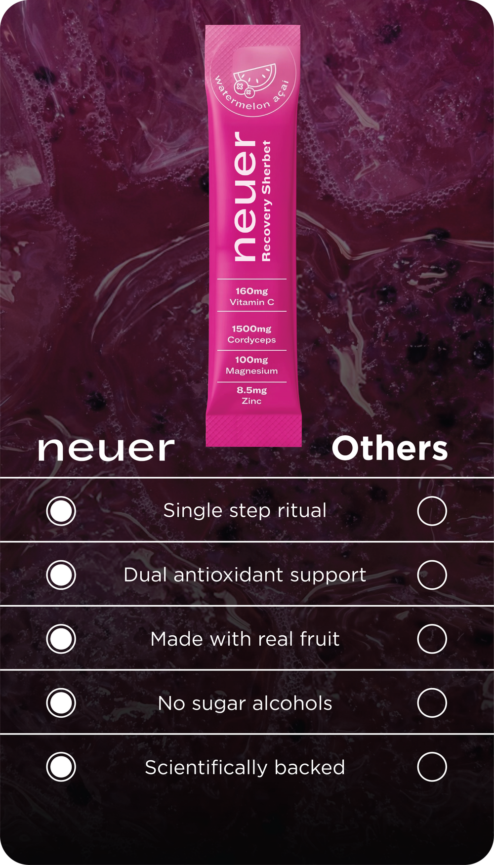 Neuer is a blend of simple yet effective ingredients that target immunity, physical recovery, and mental resilience.
